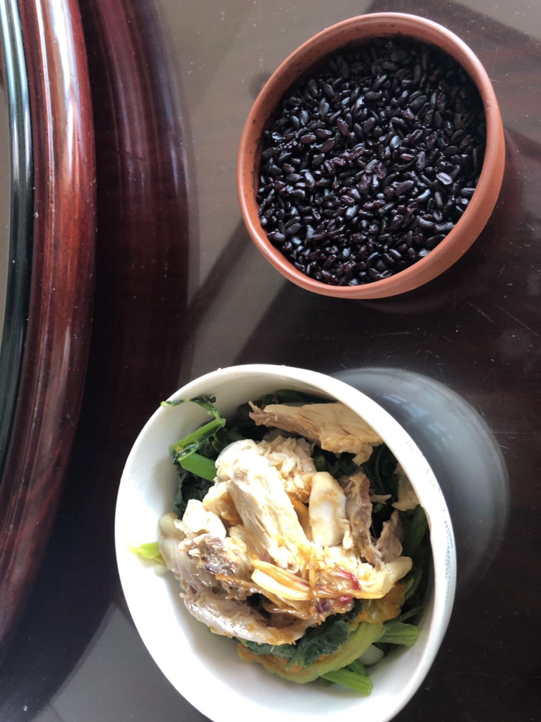 黑米饭➕鸡肉➕鱼肉➕茄子➕南瓜苗