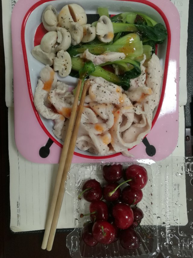 #第1天# 鸡胸肉、蘑菇、素菜、一拳米饭🍚 、几颗车厘子,非常开心😁