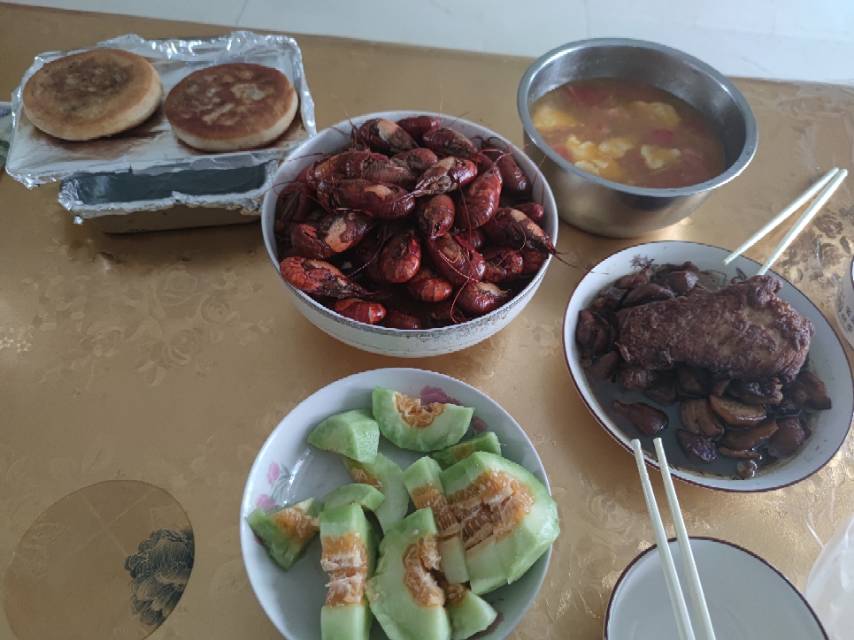 打卡中饭,小龙虾,蜜瓜,鸡胸肉,牛肉饼,还有