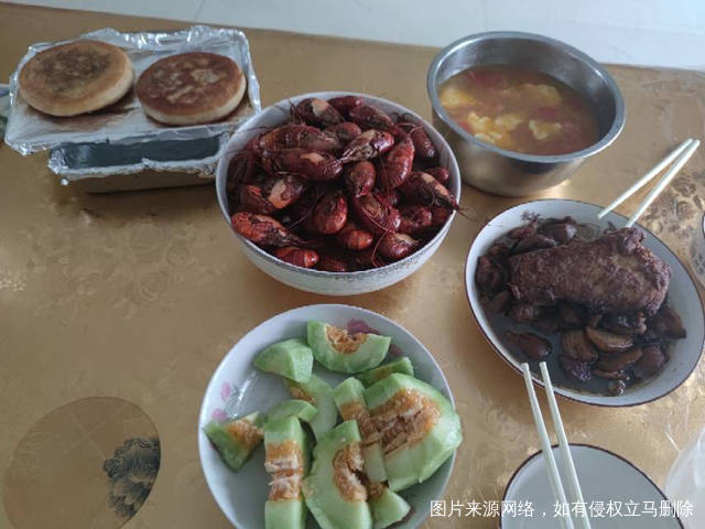 #第3天# 打卡中饭,小龙虾,蜜瓜,鸡胸肉,牛肉饼,还有鸡蛋汤。
