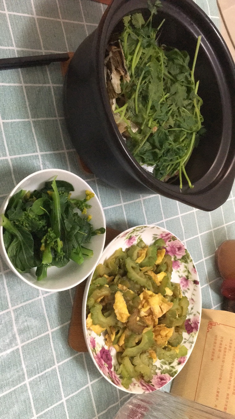 #第2天# 早餐🥣午饭🥣一起吃了,鱼头煲、焯水菜心、鸡蛋炒苦瓜