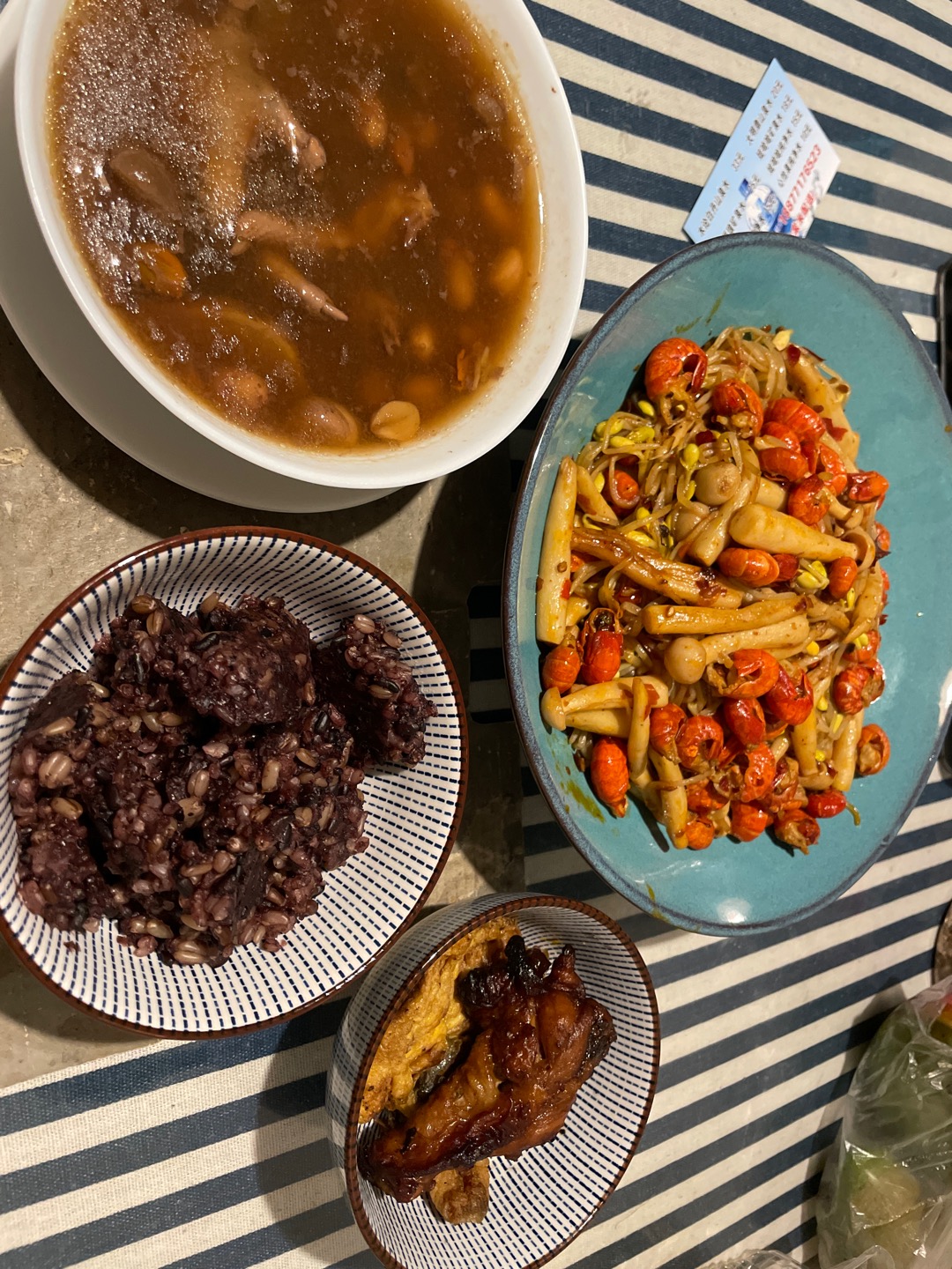 来晚餐:粗粮饭+鸡爪花生汤+炒豆芽+鸡翅根