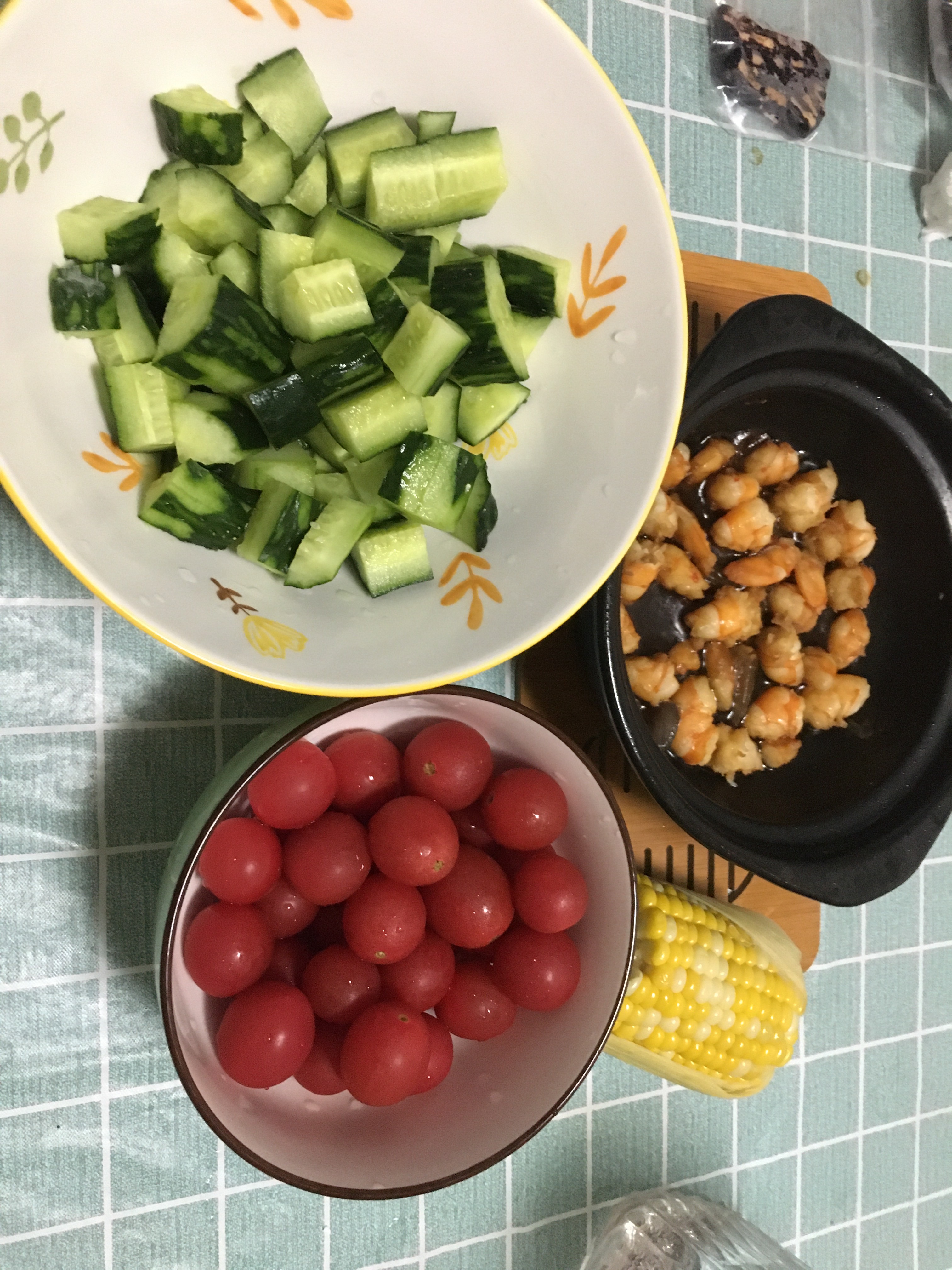 补昨晚上的晚餐🥣、虾仁🍤、黄瓜🥒西红柿