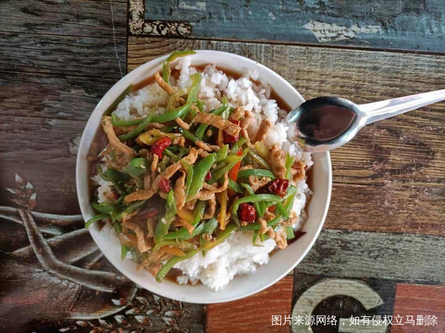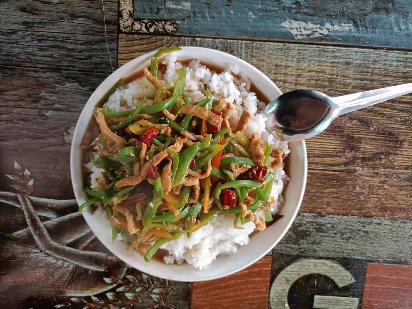 今天外出逛街上两个多小时,外面吃的尖椒肉丝盖饭