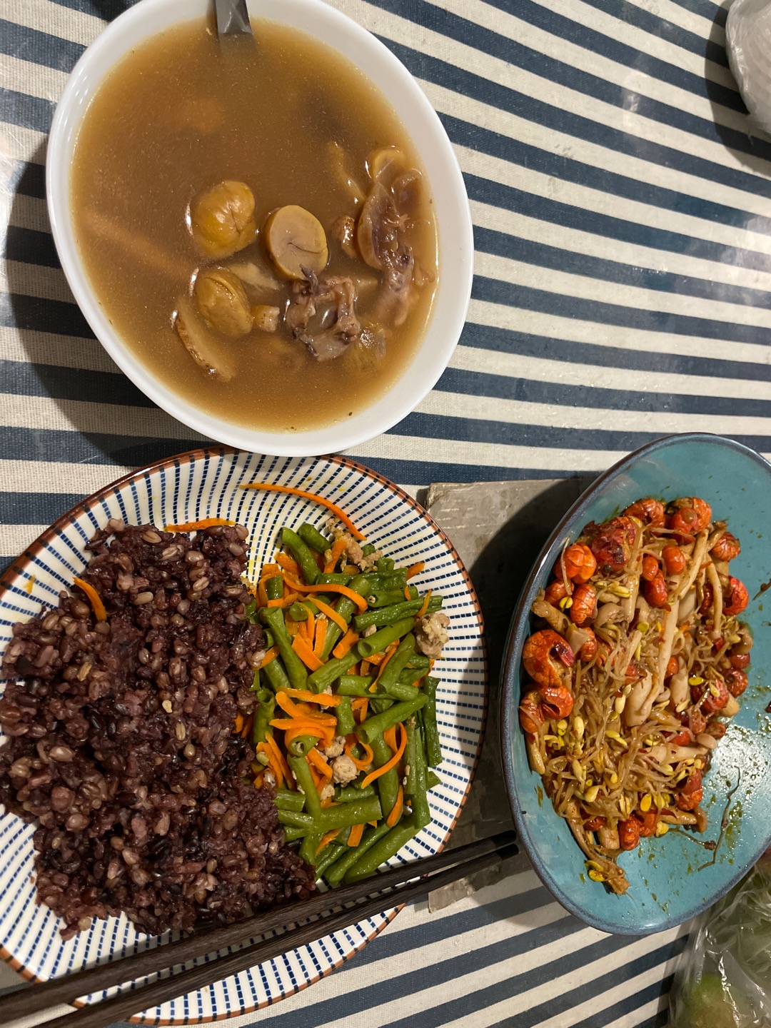 晚餐,还是吃剩菜,炖了鸡爪板栗汤
