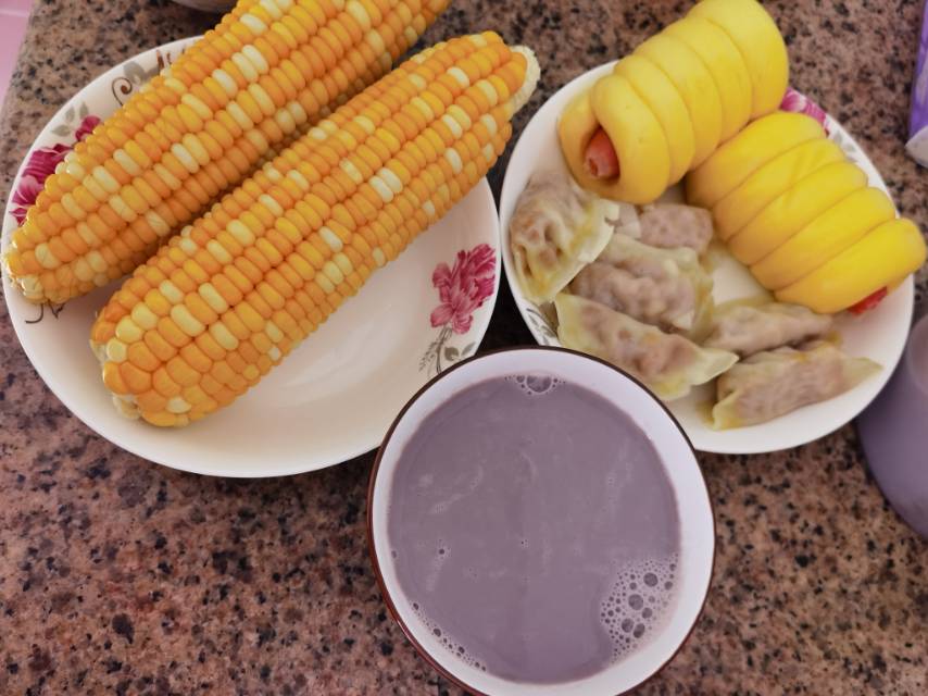 早餐:黑豆浆+蒸玉米+肠仔包+蒸饺