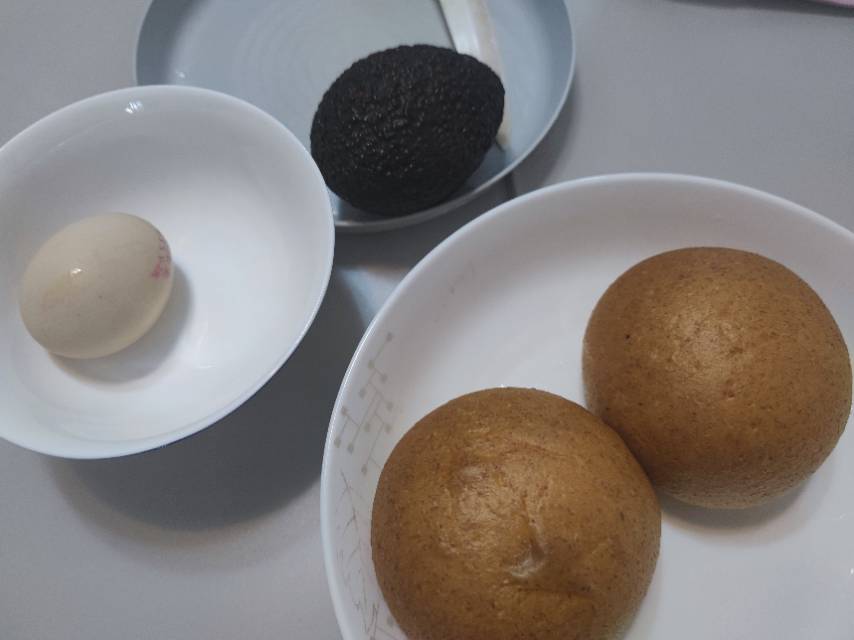 #第18天# 早餐:一个牛油果+一个鸡蛋+两个无糖诺米餐包~