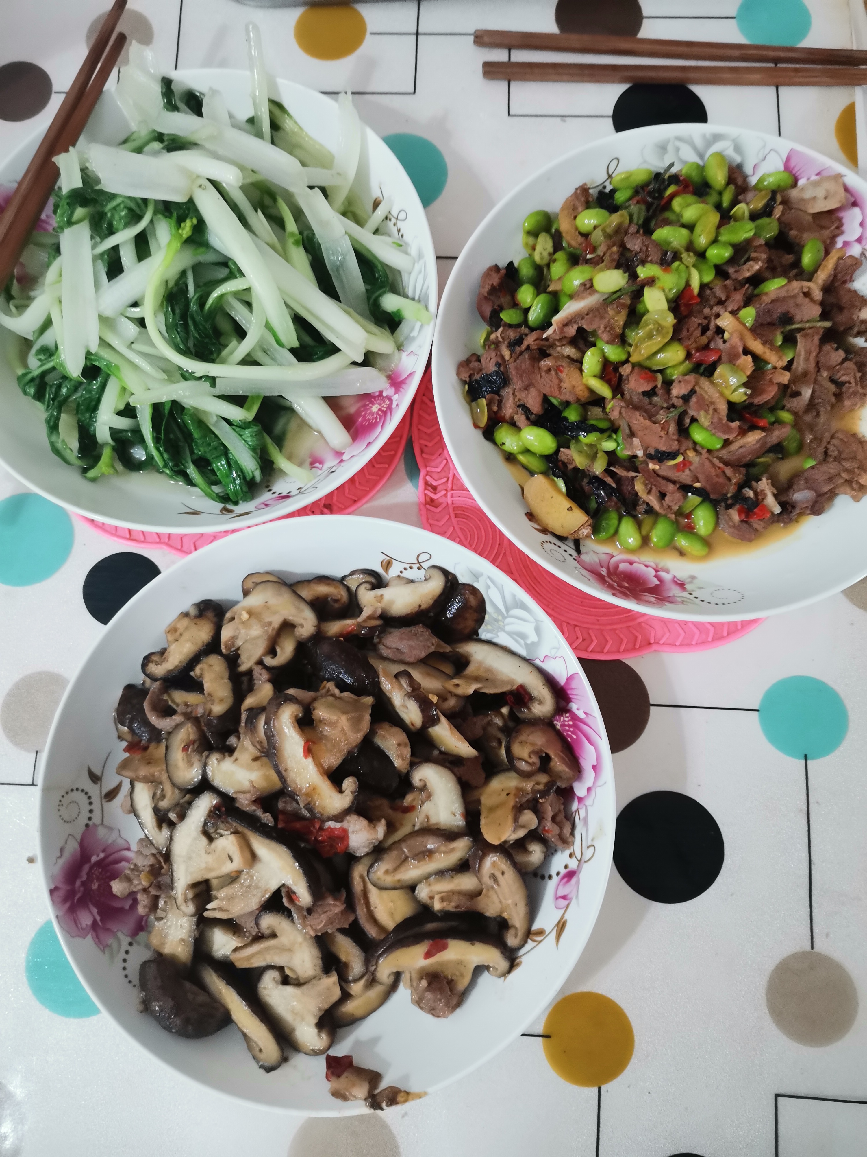 毛豆烧鸭香菇炒肉,清炒小白菜,黑米饭。