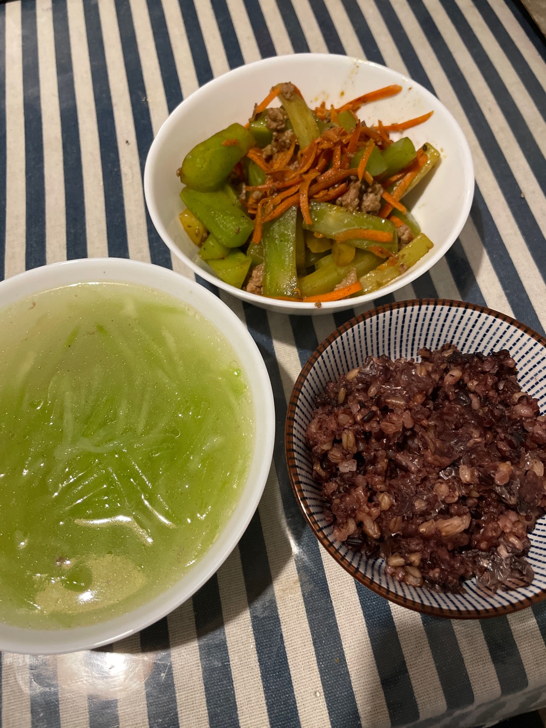 晚餐:粗粮饭一碗+炒莴笋+石瓜汤