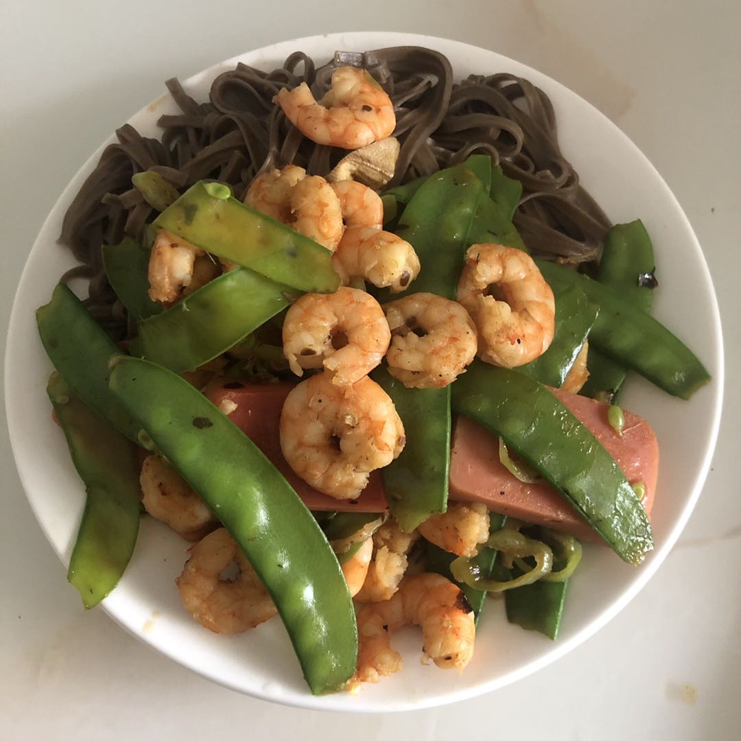 早餐鸡蛋牛奶中午荷兰豆炒虾仁荞麦面加鸡腿晚上