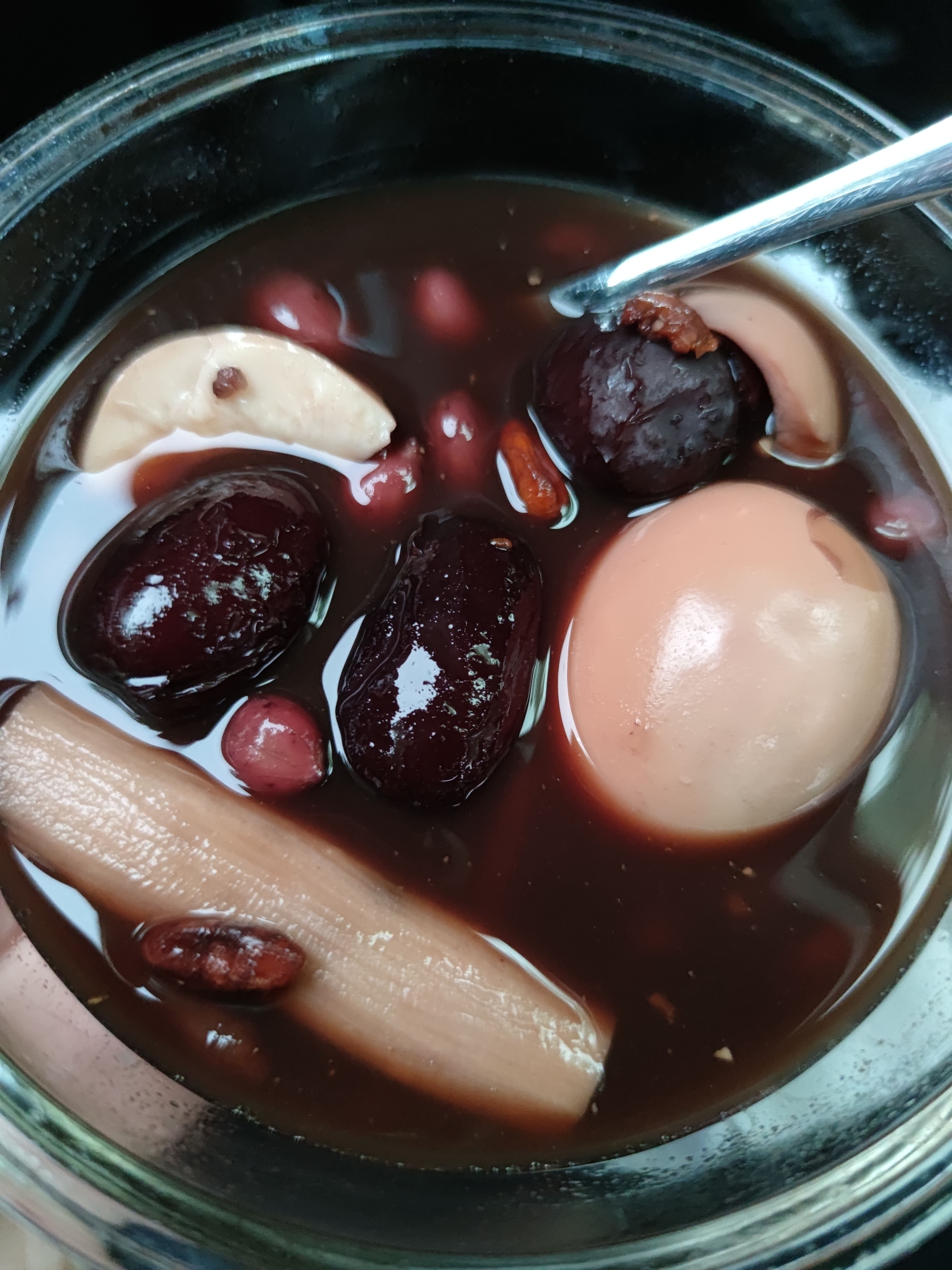 今天喝的五红汤,里面有鸡蛋,山药,红枣。