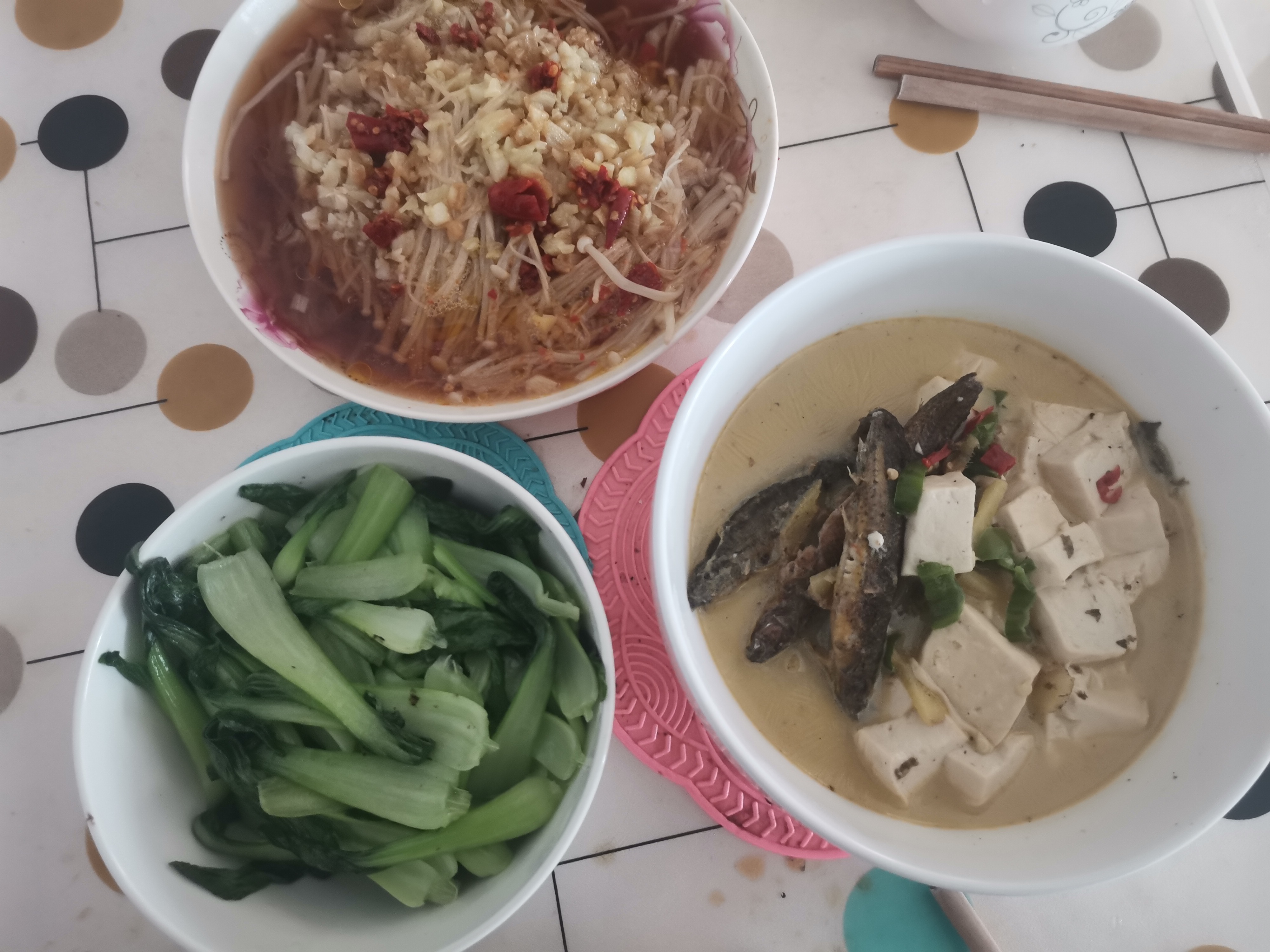 泥鳅豆腐汤,蒜蓉金针菇,清炒上海青。