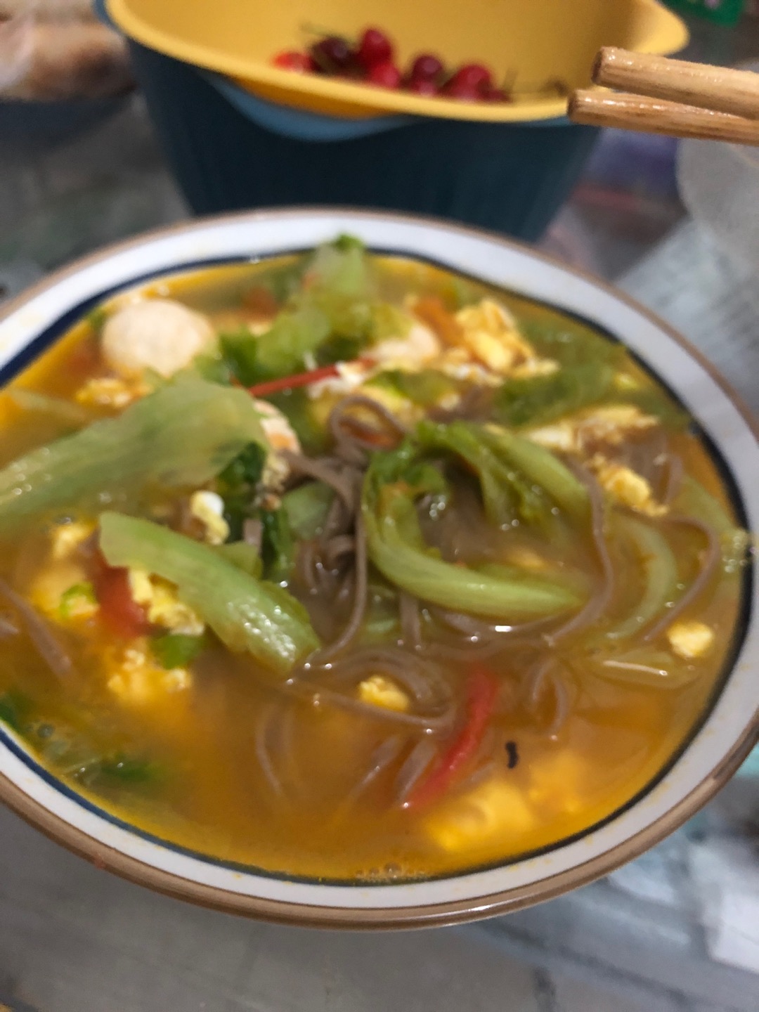 青菜鸡蛋荞麦面条晚餐