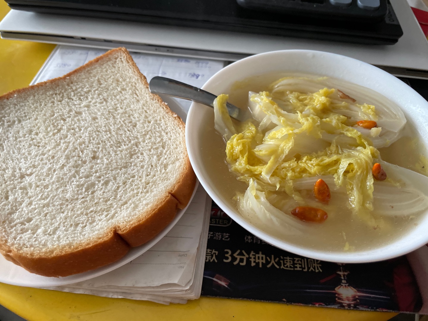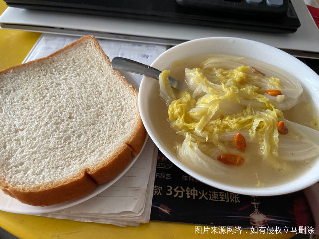 早餐:两片吐司面包+一碗娃娃菜汤
