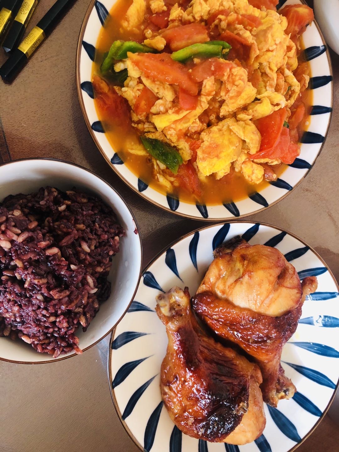 今日午餐:木须柿子➕烤鸡腿➕三色糙米饭