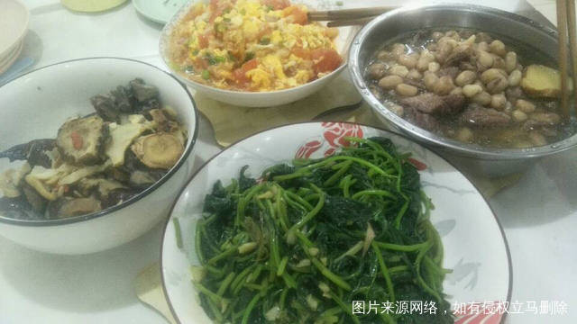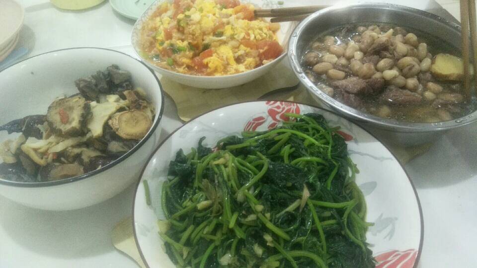番茄🍅 炒蛋,牛杂煲花生,番薯叶