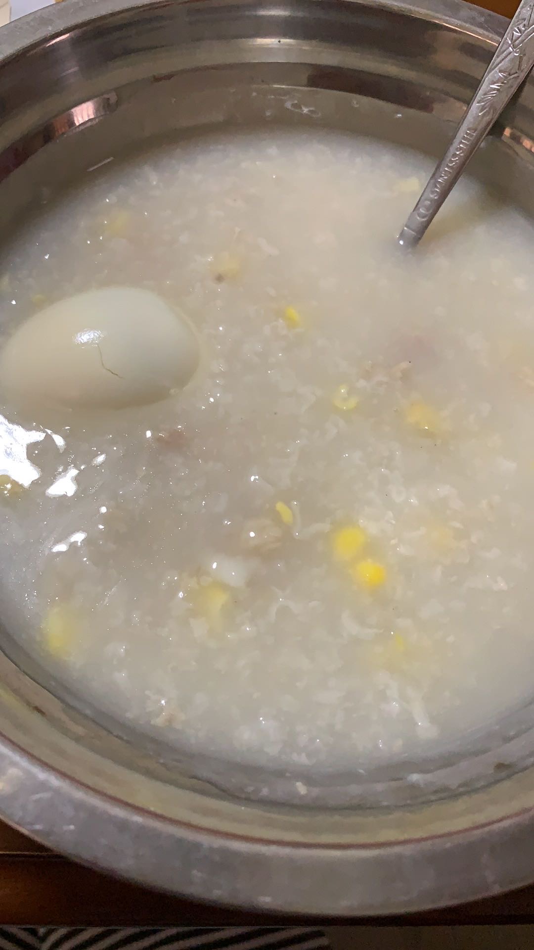 早餐:鸡蛋,玉米瘦肉粥,午餐:鸡蛋包瘦肉番茄