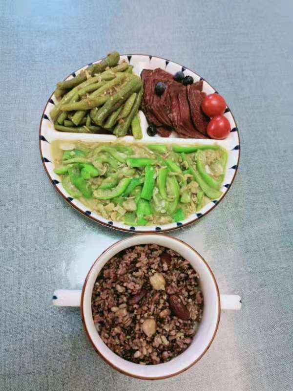 凉拌四季豆+炒丝瓜+卤牛肉+杂粮饭