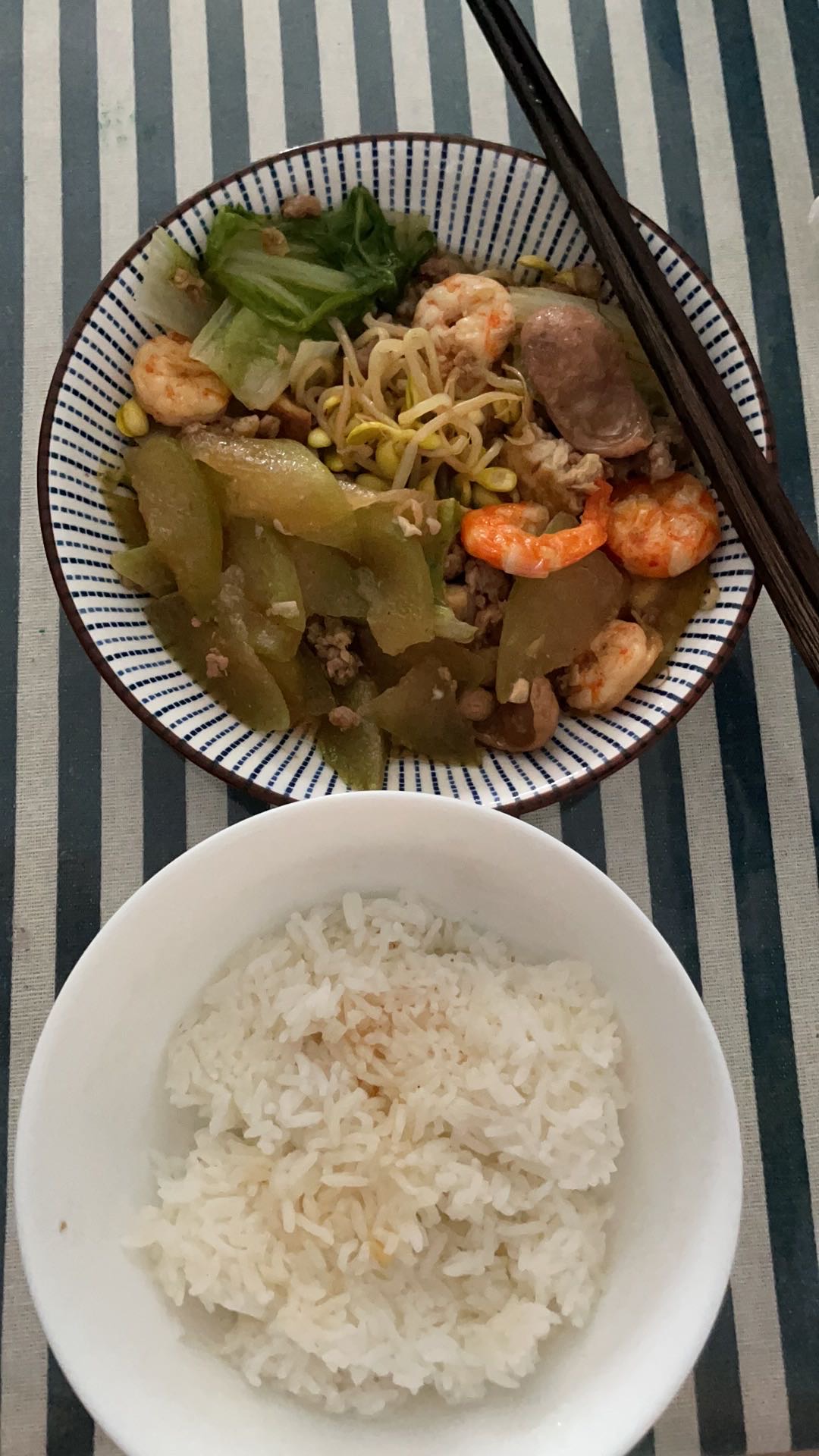 午饭:半碗白米饭+虾仁炒冬瓜+青菜+肉肠炒豆