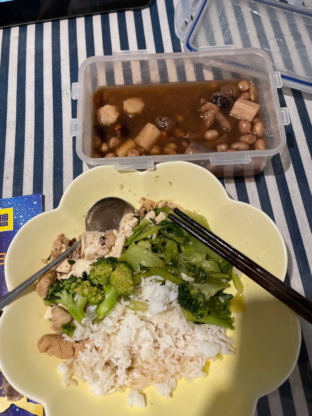 #第3天# 午餐:白米饭+鸡胸肉炒西兰花+水豆腐+青菜+鸡爪花生汤