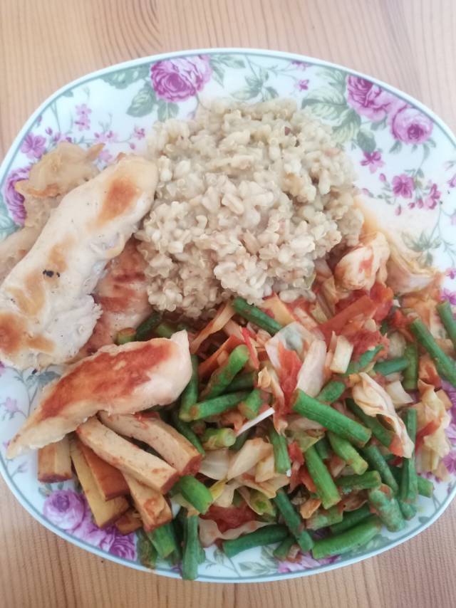#第2天# 中午,益黎米饭,炒菜,鸡胸肉
