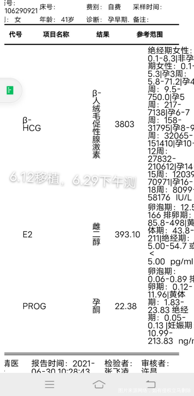根据你描述的情况,一般最早能在移植后9-10天抽血测出HCG阳性,目前检查结果考虑发育正常,建议放松紧张的情绪,耐心等待1周后复查