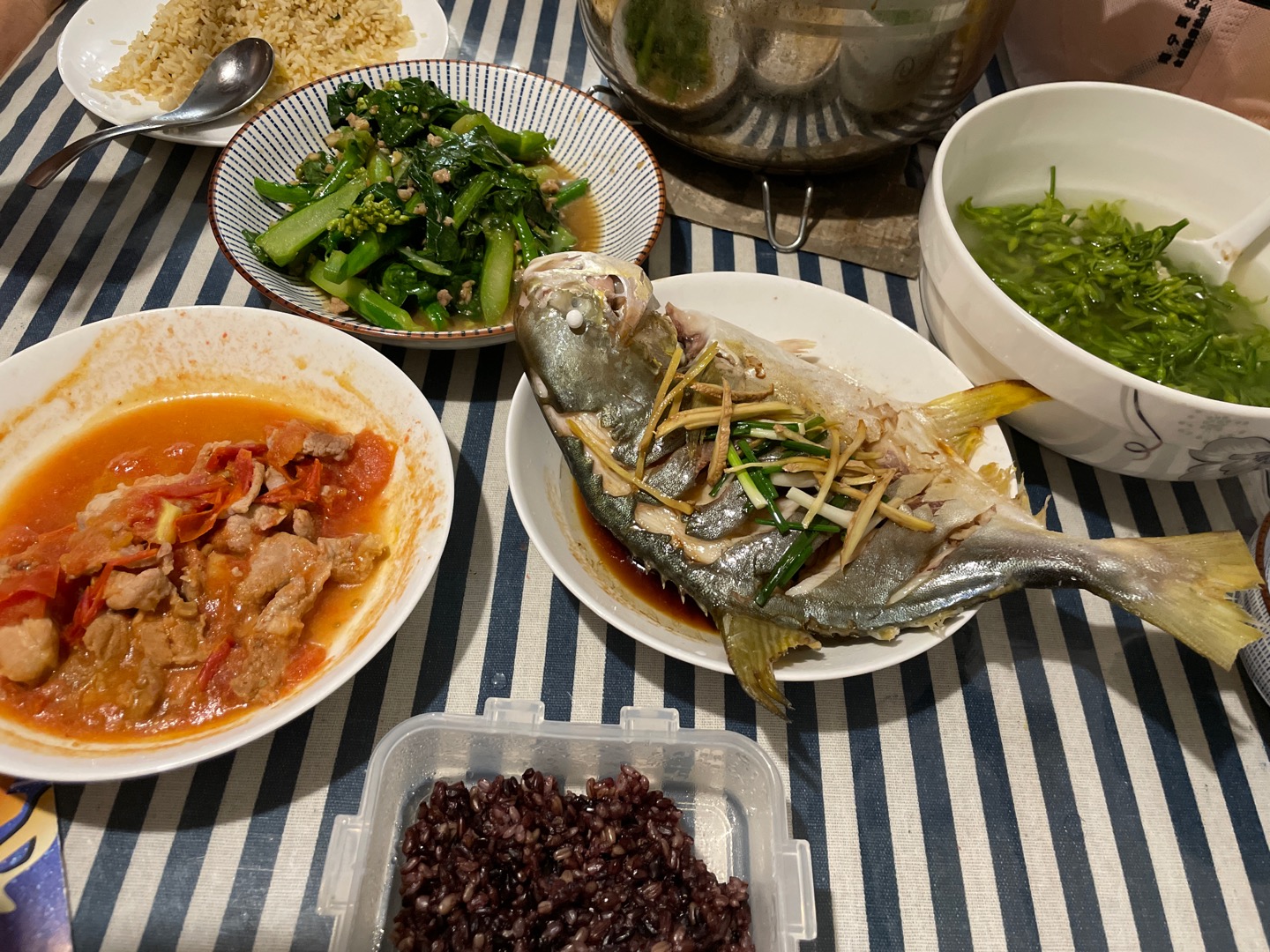 晚餐:一口粗粮饭+蒸鱼+炒芥兰+夜来香+猪肉