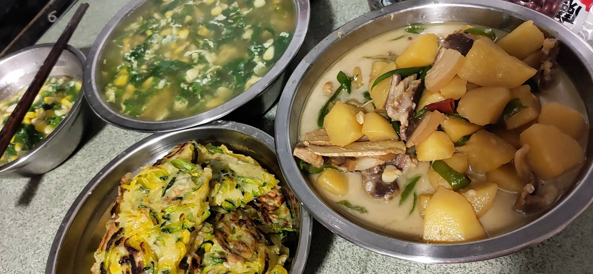 中饭:咸肉炖土豆,南瓜丝饼,玉米南瓜叶汤