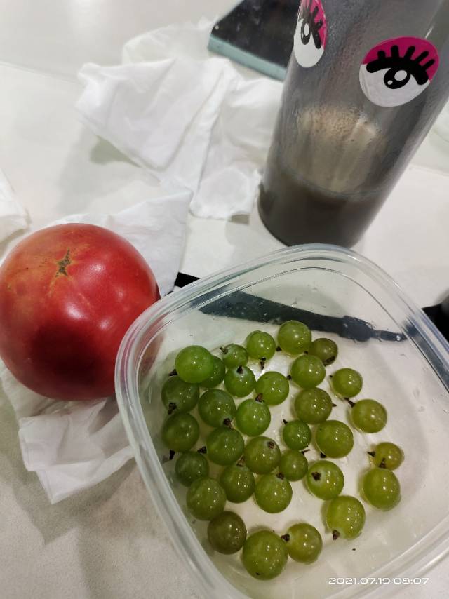 早餐,西红柿一个,葡萄少许,野菜全麦饼一片4