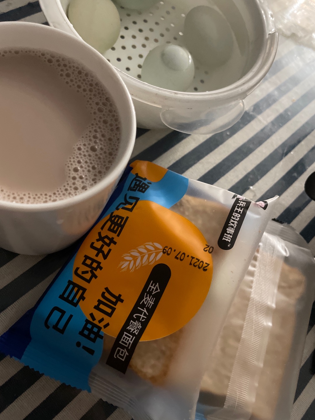 早餐:两只鸡蛋+一杯黑黄豆浆+两片吐司面包