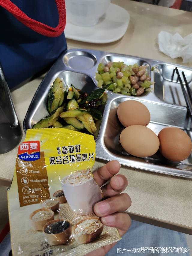 早,燕麦片。午,杂粮饭,晚,野菜饼+韭菜鸡蛋