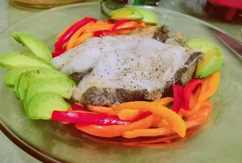 牛油果一个,彩椒,煎鱼,晚餐