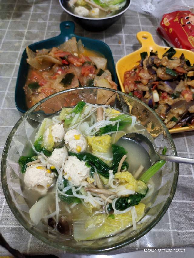 晚,蔬菜丸子汤+全麦饼一个。