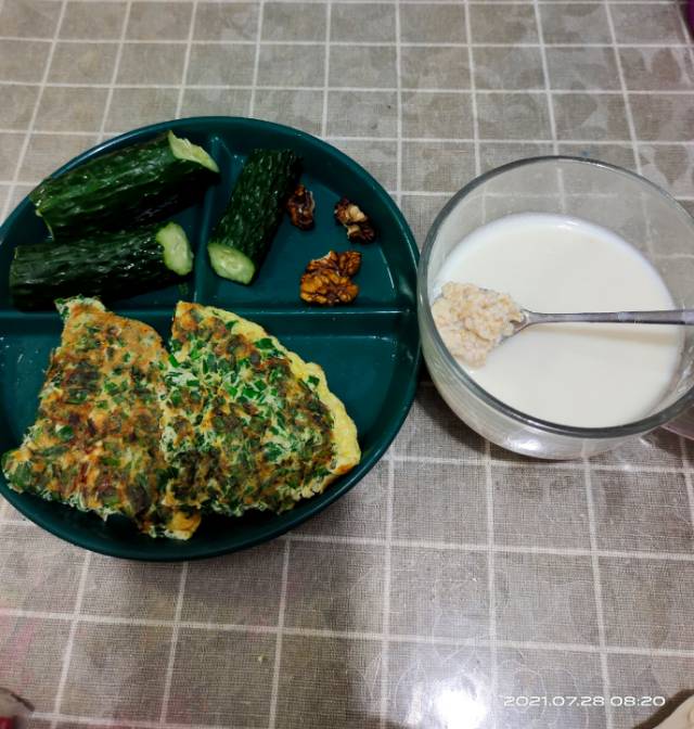 #第3天# 早,黄瓜韭菜鸡蛋饼+核桃+牛奶燕麦。