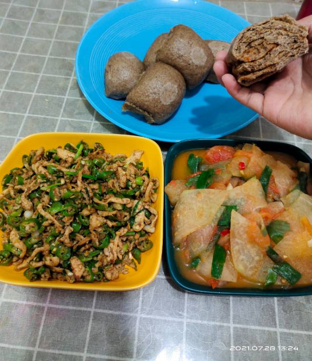 早,黄瓜韭菜鸡蛋饼+核桃+牛奶燕麦。 午,全