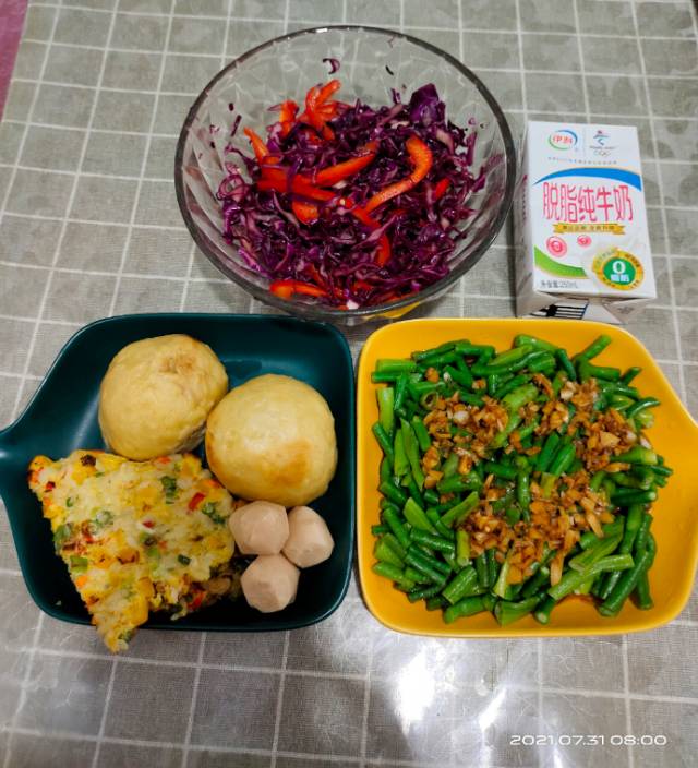 #第5天# 早饭,蛋饼两片+一包鸡肉丸+凉拌紫甘蓝+少许豆角。午,公司聚餐各种肉肉😂。晚,凉拌紫甘蓝