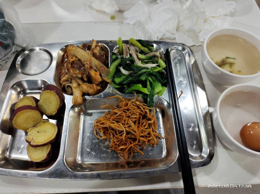 早,鸡蛋牛奶+全麦馒头+烩菜。午,杂粮饭红薯