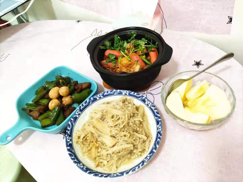 青椒炒猪肝,金针菇,排骨炖萝卜