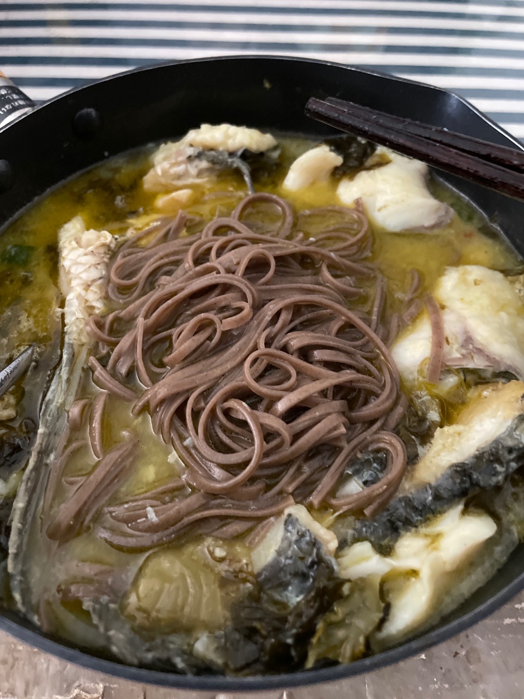 #第9天# 午餐,煮昨晚打包的酸菜鱼,然后加荞麦面