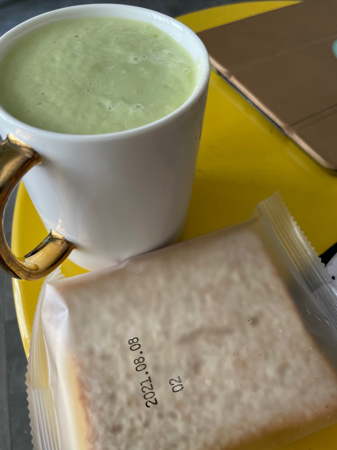 早餐吃晚了点,牛油果奶昔和一个面包片