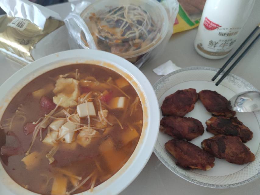 打卡今天的中饭,鸡翅,凉拌菜,豆腐汤。