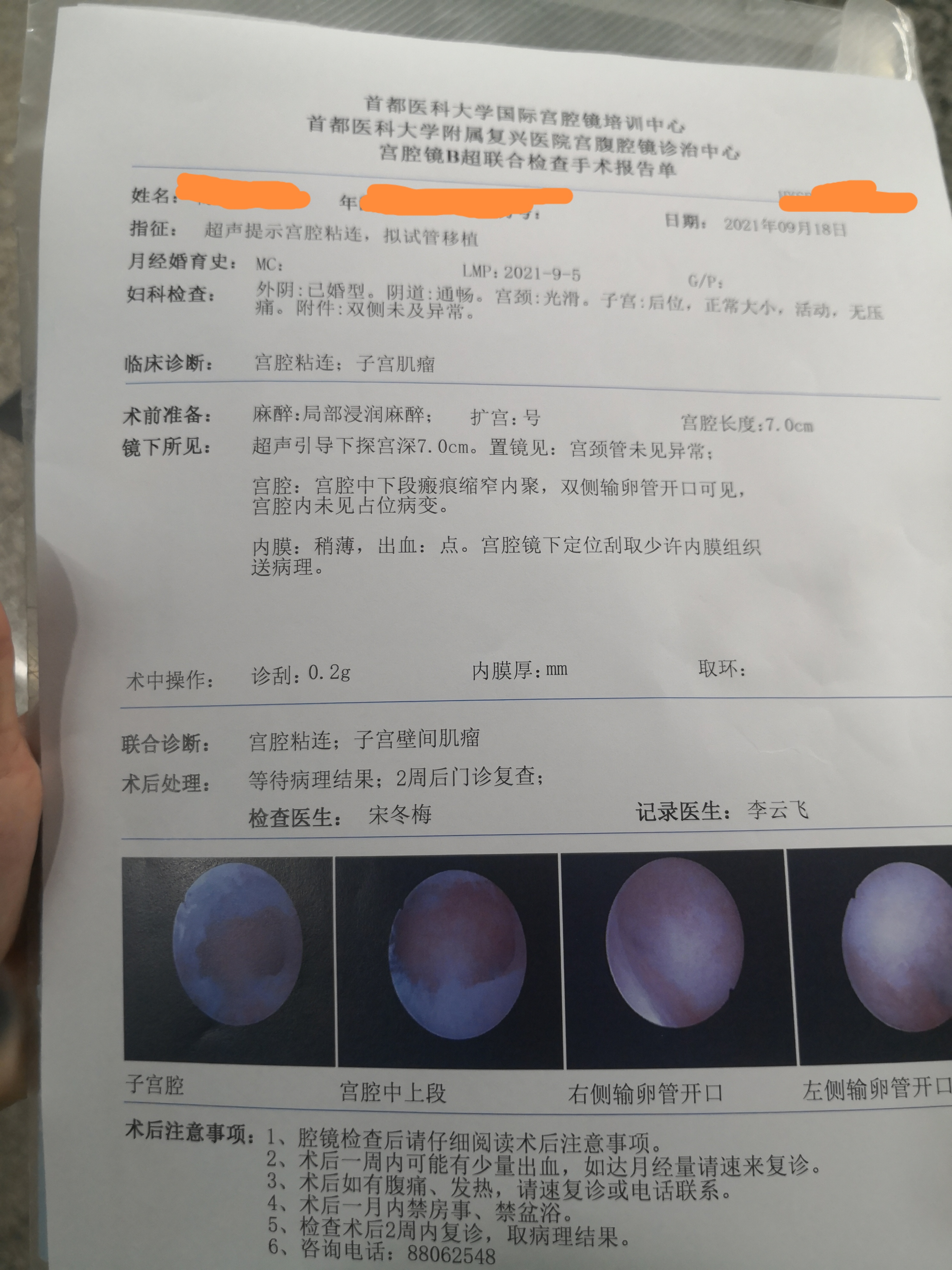 大夫您好今天刚做完宫腔镜检查能否帮看看我的粘