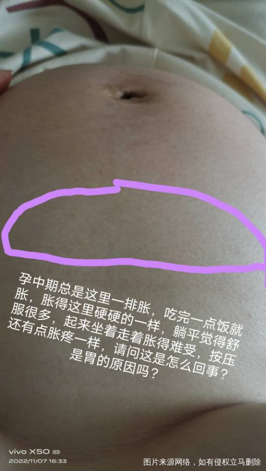 目前孕28周+了,孕中期也总是反酸吐口水,现在偶尔反酸就是胀的厉害,胸下来肚鸡眼上来我圈起那个一排位置,看下是消化不良还是什么原因?