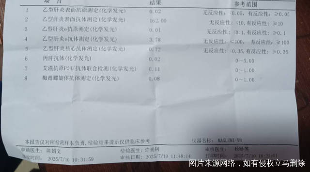 查了乙肝的,产生了乙肝表面抗体是好的,其余全是阴性。亲,正常的呢
